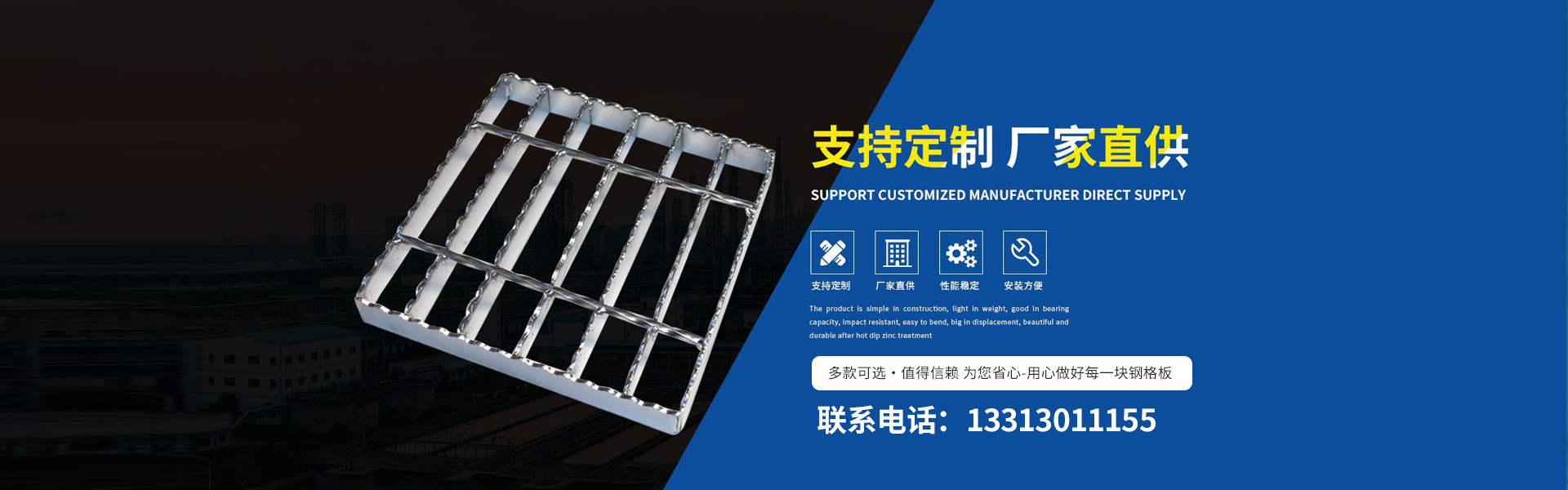公司產品有鋼格板、踏步板、溝蓋板、鋼格柵板、等產品。對于客戶要求的不同工作環境,承載力、跨度、形狀和顏色,提供相應設計方案及成本控制。 我公司秉承“以客戶為中心,以低價高品質為基礎,以客戶滿意為目標”的經營理念,以優惠的價格、好的技術設備來贏得用戶的信賴,衡水新超峰金屬網業制造有限公司熱誠歡迎廣大客戶光臨。 衡水新超峰金屬網業制造有限公司成立迄今,正是由于各界朋友們對于我們的持續支持與關懷,及本公司全體同仁辛勤的耕耘與付出,使公司持續發展與茁壯成長。展望未來,我公司人懷著感恩之心,更加追求...